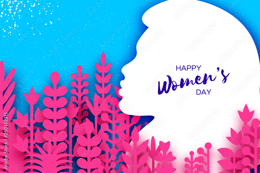 Happy Womens Day Greetings Card 8 March Paper Cutout Girl Head Silhouette Cutout With Pink Origami Flowers And Leaves Mothers Day Spring Holidays Blue Stock Vector Adobe Stock